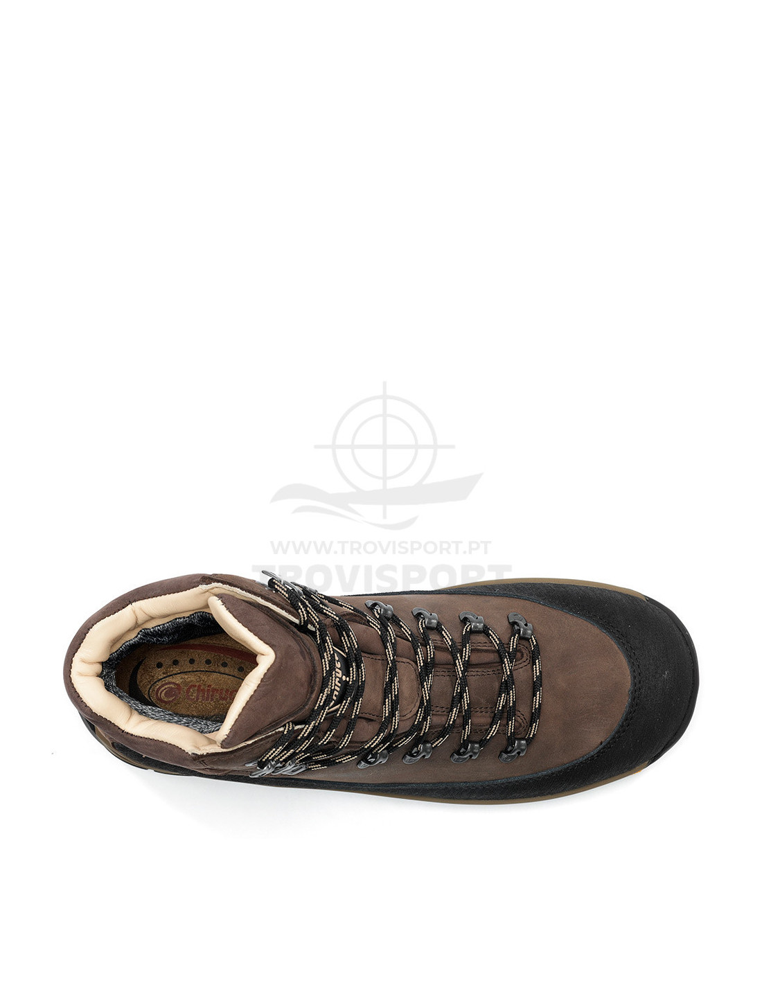Adequado para terrenos acidentados. Bota em couro nobuck de alta qualidade, reforço perimetral, membrana Gore-Tex impermeável e respirável e sola Vibram® com grande aderência e resistência ao desgaste.