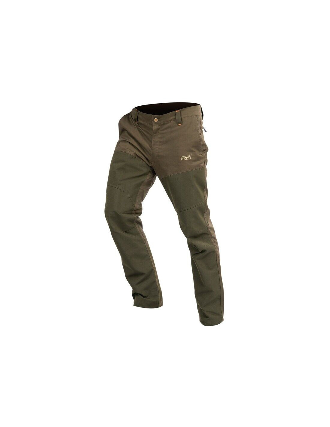 Conforto e reforço para a caça em tempo seco. Construção com seis bolsos: dois bolsos enviesados (um com micro-fecho interior), um bolso lateral com fecho na coxa direita e dois bolsos traseiros com fecho.