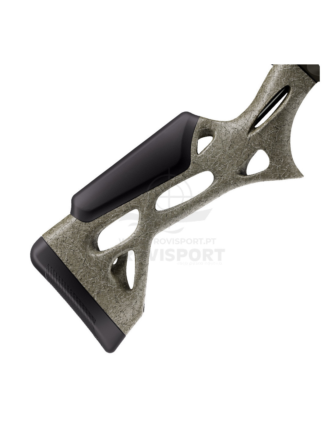 Coronha especial em polímero de alta resistência com acabamento castanho casca de árvore e textura em relevo em duas cores. Comprimento da coronha ajustável