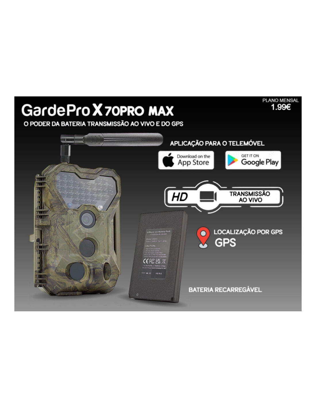 Conectividade e App: Através da aplicação GardePro Mobile (iOS e Android), pode visualizar imagens em tempo real, receber notificações instantâneas e até localizar a câmara via GPS integrado.
